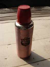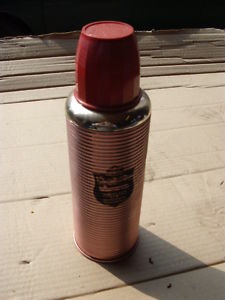 gebrauchte Thermoskanne aus Aluminium und Becher